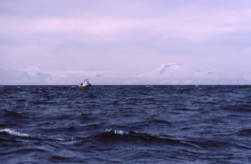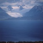 キーナイ半島の白い山々と漁船