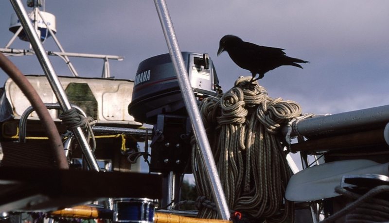 強風の朝、デッキ上のゴミをカラスが漁っている・・・始末を忘れていた