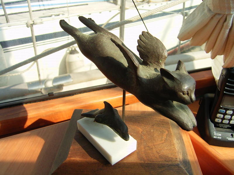 最後にパコそっくりのぬいぐるみと前の船のオーナーが置いていった2匹のミスターホワイトベアー、ミスターブラウンベアーと大事な飛ぶ猫の彫刻を乗せた。